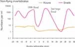 For non-flying animals like snails and koura (freshwater crayfish), recovery rates partly depended on how quickly they reproduce. Snails have short generation times, and their populations had recovered within nine months of the flood (see top graph, right). But koura, which reproduce more slowly, took almost three years to recover.