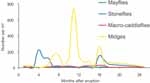 The Mangaturuturu River on the western side of the mountain received acidic lahar material and had low pH levels except in winter, when contaminants were presumably locked up in snow and ice. During winter, one species of midge colonised and completed its short life- cycle (see graph, right). In two successive springs very small stonefly nymphs were quite common, but water quality deteriorated as snow melted and the stoneflies were unable to complete their much longer life-cycle.