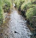 The study stream enters the main stem about 6 km upstream from the sea. It is only about 1.5 m wide and is cut into 1-m high banks. About 400 m upstream of the limit of tidal influence is a 7-m-high waterfall that prevents inanga from moving farther upstream. Although the surrounding area is in pasture, there is still a good riparian strip of manuka and gorse, and plenty of bank-side vegetation overhanging the stream. Small, woody debris is also a feature of the instream cover.
