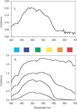 Water colour differs among lakes because materials in the water affect different wavelengths of light by different amounts. The graphs show irradiance (a measure of light energy) plotted against the wavelengths (colour) of light for Lake Taupo.
