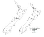 We tested for trends in the annual average total periphyton cover and the annual maximum cover over the 13 years of monitoring at each site. There was no trend at most sites from 1989 to 2001. However, annual average cover decreased at fifteen South Island sites and four North Island sites, whereas it increased at only four sites – all in the North Island.