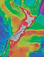 The New Zealand coastal zone (including estuaries and the coastal ocean) lies above the “continental shelf”, bounded by land on one side and the continental slope (100–200-m water depth) on the other. The red area on the map illustrates the extent of our coastal zone. The water in this zone is constantly moving and mixing – a bit like atmospheric weather patterns, but on a much slower time scale.