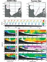 Examples of some of the BIOFISH data (right) illustrate the level of complexity and variability within both Golden Bay and Tasman Bay. The transects were sampled in early summer, and in both bays display the typical estuarine characteristic of low-salinity surface layers from freshwater riverine input. Stratification in the water column varies between and within bays. Tasman Bay waters are saltier and cooler, and have higher light transmittance (water clarity) and chlorophyll a than Golden Bay waters. Bottom waters are turbid in both bays, especially Golden Bay. The distribution of chlorophyll-a varies both vertically and horizontally, displaying deep maxima around the thermocline and pycnocline.