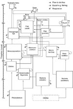 We simulated the Southern Plateau food web using the EwE model, based on the framework shown on the right. For all ecosystem components (boxes) we entered biomass, the ratio of food consumption and production to biomass, and diet. The model also took account of fish catches, incidental bycatch, and discards. Our aim was to identify and quantify the parts of the oceanic food web that support the birds, mammals and fish of the Southern Plateau and evaluate the effect on top predators (including birds) of removing fish and squid.