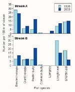 In 2003, identical fish surveys were carried out to measure whether the objectives had been achieved. Results for the two streams surveyed in both 1995 and 2003 differed (see graph). In Stream A, most species increased in number, as did total fish numbers, although the increase was less than 50% (from 63 to 80 fish per 150 m of stream). Although the abundance of banded kokopu in Stream A decreased a little over the whole stream, more banded kokopu were found in the restored reaches than previously, suggesting they were becoming established in the restored habitat. A new species, lamprey, was found in Stream A, but common bully disappeared.