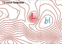 The UM analysis at 12 UTC 20 June 2002 of the Mean Sea Level Pressure (MSLP) field, and forecasts made for that time 24, 48 and 72 hours in advance. The blue Hs mark the analysed centres of anticyclone, while the red Ls mark the analysed centre of the bomb.