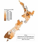 In November 2003 the web-mounted Inventory of New Zealand Greenhouse Gas Emissions was released under the National Centre for Climate–Energy Solutions. Total greenhouse gas emissions in 2001 for all Territorial Local Authorities in New Zealand are available, including the assumptions and formulae used to calculate the emissions.