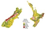 New Zealand-wide information is now available to help in cases like these. It is in the form of a geographic information system (GIS) layer of specific suspended sediment yield, or SSY, given in tonnes of sediment per square kilometre of catchment area per year (t/km2/y). The layer (see map below) can be used to estimate the amount of sediment delivered from within any defined catchment boundary. So far, we have used the layer to estimate the suspended sediment yields to the coast from major rivers as well as the total yield to the New Zealand coast.