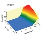 Having established the environmental relationships for a species, we can export results from the statistical models to a geographic information system. There they are combined with maps of the various environmental factors to calculate and map probabilities of capture in geographic space. In the example shown above, predicted probabilities of capture for snapper, based on spatial variation in water temperature, salinity, chlorophyll a, sea-surface temperature gradients, sea-bed slope, and distance from the coast, coincide closely with the observed geographic distribution, indicating a good fit between the model and the underlying data.