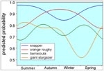 When we model the distributions of mobile organisms such as fish, the relationship between the catch rate for a species and the environment may vary depending on the time of year. This may reflect seasonal changes in behaviour within a particular environment, or perhaps seasonal migrations. We can accommodate this complexity by adding terms designed for circular data, which allows a curve to be fitted that describes the regular seasonal trend in capture rates. Examples of seasonal changes in catch rate modelled using this approach are shown in the graph.