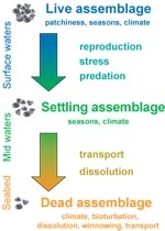 Factors influencing distribution vary and result in different assemblages (groups of individuals occurring together at one time and place). Oceanographic factors (temperature, salinity, layering, flow) and biological factors (nutrients, oxygen, light) control the abundance, size, and composition of populations. Bioturbation (biological activity on the seafloor that can mix fossils of different ages together) leads to a fossil assemblage representing time ranging from a few decades to hundreds or thousands of years.