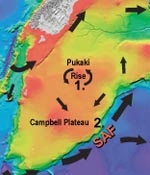 The pie chart shows where the dominant forams were found. Over Pukaki Rise, about 99% of the foram flux (the amount of sinking matter passing through a depth) occurred during a spring bloom and was dominated by Gt. inflata and Gg. bulloides. Over the flank of Campbell Plateau, half of the foram flux occurred in a spring bloom, when Gt. inflata and lesser amounts of Gg. glutinata prevailed. During autumn and winter more than 40% of the foram flux was deposited, with Gt. truncatulinoides dominating.