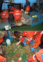 In February 2004, in collaboration with our Italian colleagues, we participated in the Victoria Land Transect (VLT) project onboard RV Italica. The aim of this voyage was to characterise and quantify changes in benthic communities along the Victoria Land coastline, particularly in nearshore regions where very little research has ever been conducted. Italica visited four locations in the northwest Ross Sea which span several degrees of latitude and a wide range of environmental conditions: Cape Adare, Cape Hallett, Coulman Island, and Cape Russell. These locations have varying levels of sea-ice cover, iceberg disturbance, proximity to polynyas, and biological productivity. At each location we sampled the benthic communities and habitats (for example, cobbles, sand, rock) in environments ranging from 100 to 500 m deep, using a variety of techniques, including dredge and grab sampling and video imagery.