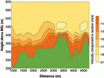Challenges remain in the modelling of the atmosphere at scales below 10 km because models representing all of New Zealand have very large computing requirements. Modelling a local area is possible, and excellent progress has been made in the microscale by simulating individual eddies (see 'Microscale modelling around Wellington' below). Progress has also been made with models that parameterise (represent, rather than detail) the eddy motions, including the stability effects that are very important in the mesoscale. The yellow and green diagram shows the velocity from one such model and demonstrates how the flow varies over a hilly area with a hydraulic jump (a downstream 'wall' or ridge) just to the left of the highest point.