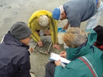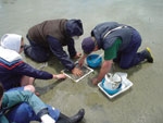 In July 2004, we transplanted cockles to two different areas on the Takahiwai sandflat. Half of the cockles were placed in cages, to protect them from potential predators, and we transplanted cockles at different densities. We have monitored the cockles at regular intervals since, recording how many have survived and how large they grew, to help us assess the success of the re-seeding trials in the long term. After one year, results showed higher survival in uncaged plots. In November 2005, we began new trials using a variety of plot sizes and constant cockle densities. As before, we will monitor their growth and survival at regular intervals to determine their success; we envisage that these trials will remain in place for at least a year.