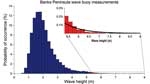 In our examples we’ve used one particular type of extreme-value model, the Weibull model. In the upper graph, the model has been adapted to provide the closest match with wave data from Banks Peninsula from 1999 to mid 2006. The lower graph shows the model’s prediction of extreme wave heights for longer return periods up to 50 years.