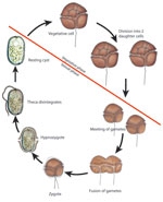 Dinoflagellate life cycles vary somewhat, depending on the species. Usually, the life cycle combines a vegetative phase and a sexual phase. In the vegetative phase, most cells remain motile while dividing into two daughter cells. In the sexual phase, two reproductive cells (gametes) produced by individual vegetative cells fuse to form a cell called a zygote (which looks like a vegetative cell with two trailing flagella). In the case of armoured species, the theca thickens and the cell becomes either warty-looking or spiny. At this stage it is referred to as a hypnozygote. For some species, the hypnozygote usuallyremains dormant for a period of time before the theca disintegrates, revealing a form called a resting cyst. Finally, the resting cyst germinates and becomes a motile vegetative cell; for other species the hynpzygote germinates directly into vegetative cells, and the cycle begins again.