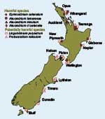 - A survey has identified six species considered harmful or potentially harmful in the sediments of ports and harbours around New Zealand.