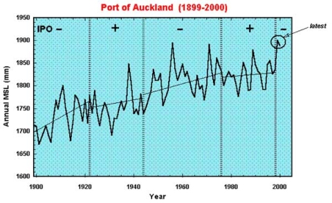 In the graph, we have divided the Auckland record since 1899 into positive and negative phases of the IPO. Notice that when IPO is in its negative phase, sea level rises faster than when IPO is positive. The Pacific has just come out of a positive phase (from 1976 to 1998), so we can expect sea level to rise faster than it has over the last 20 years. We are already observing increased sea levels at many of our recorders. We predict that sea level will rise more rapidly over the next 20 years or so until the IPO switches back to its positive phase, when sea-level rise will slow again.